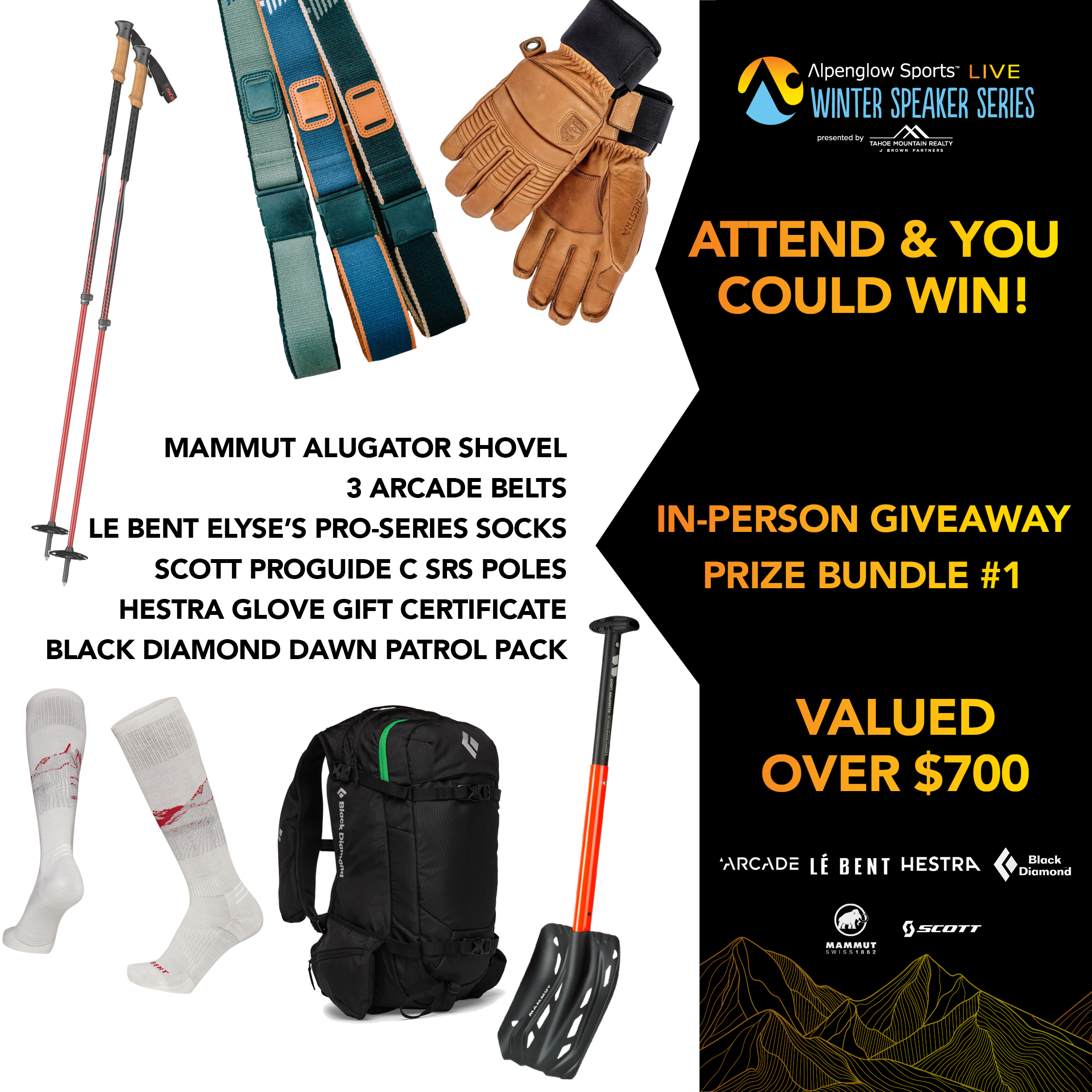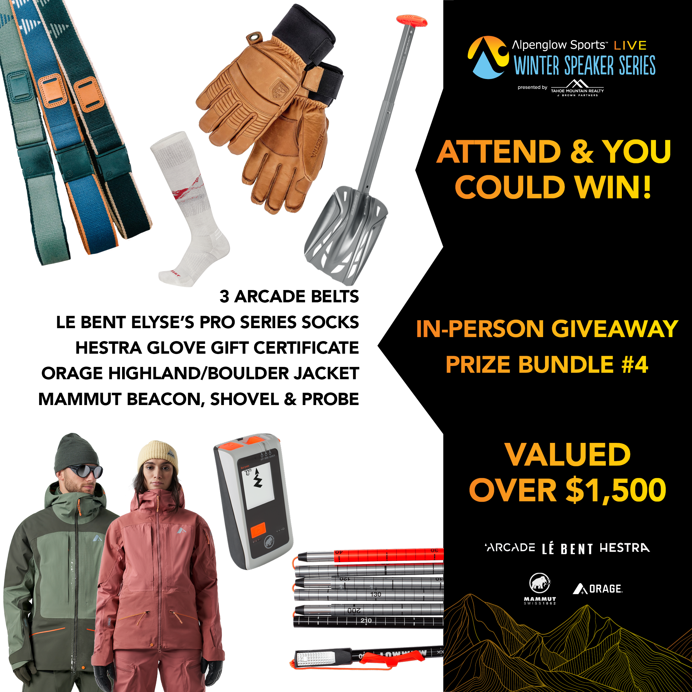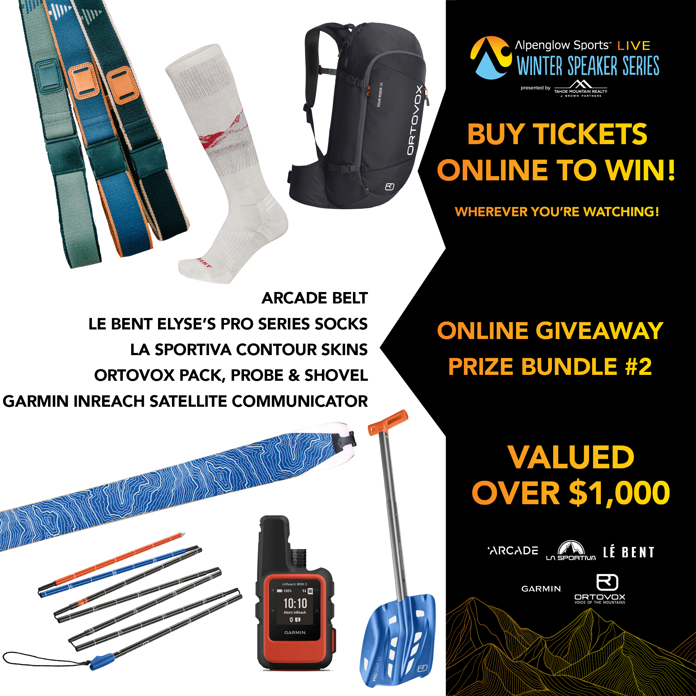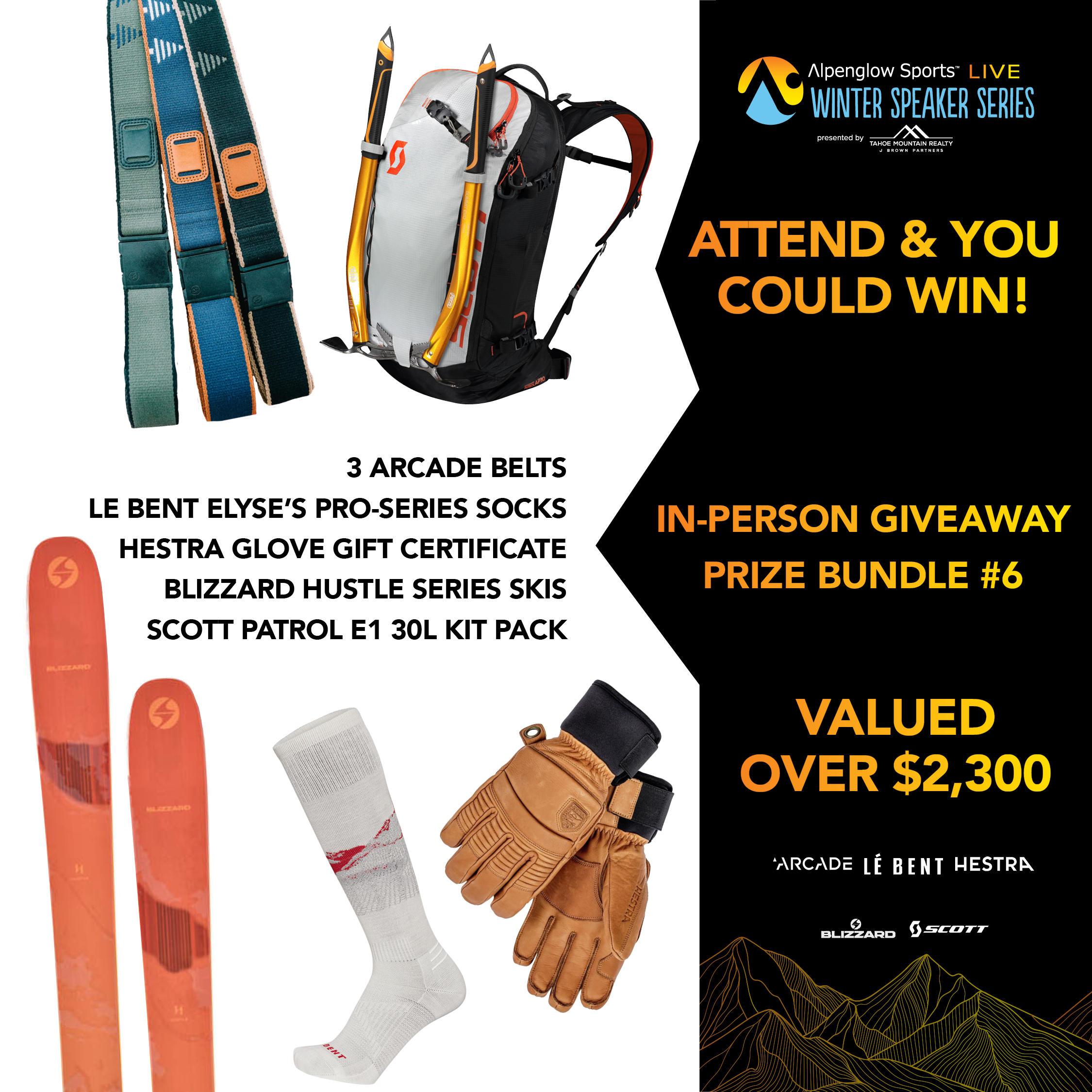 Thanks to Elyse's sponsors who are putting on an incredible giveaway for our in-person and online events. Elyse's sponsors like Arcade Belts, Hestra, Le Bent, Mammut, Orage, Tecnica/Blizzard, and Scott will add there prizes to our event sponsors and more. We expect over $15,000 in giveaway prizes.