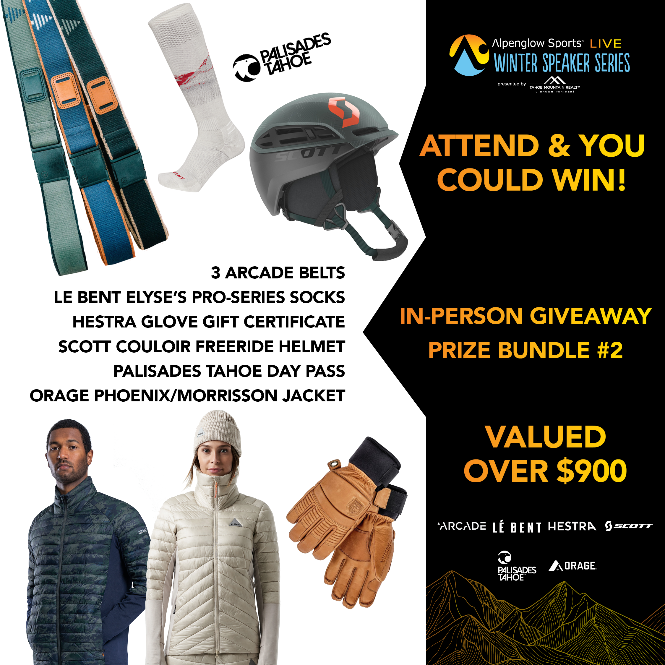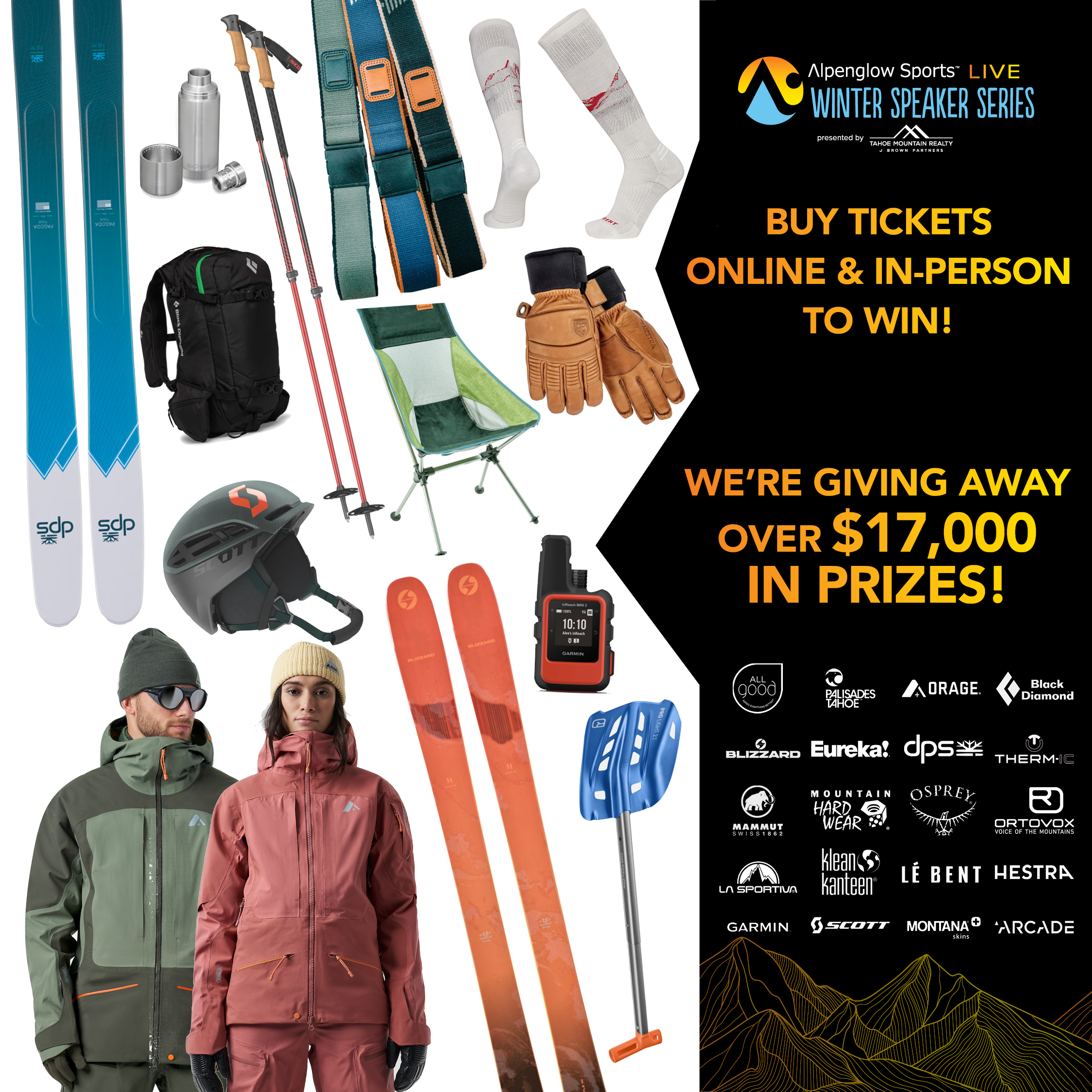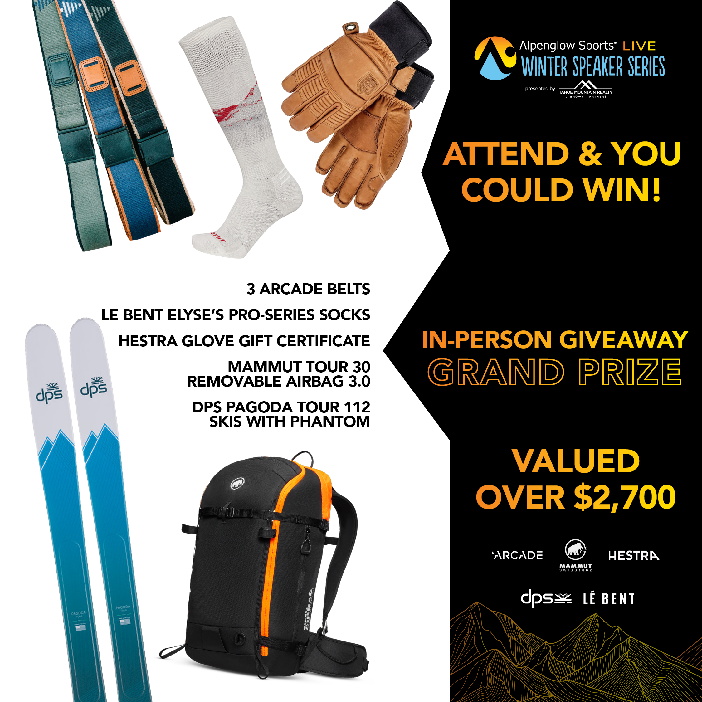 Thanks to Elyse's sponsors who are putting on an incredible giveaway for our in-person and online events. Elyse's sponsors like Arcade Belts, Hestra, Le Bent, Mammut, Orage, Tecnica/Blizzard, and Scott will add there prizes to our event sponsors and more. We expect over $15,000 in giveaway prizes.
