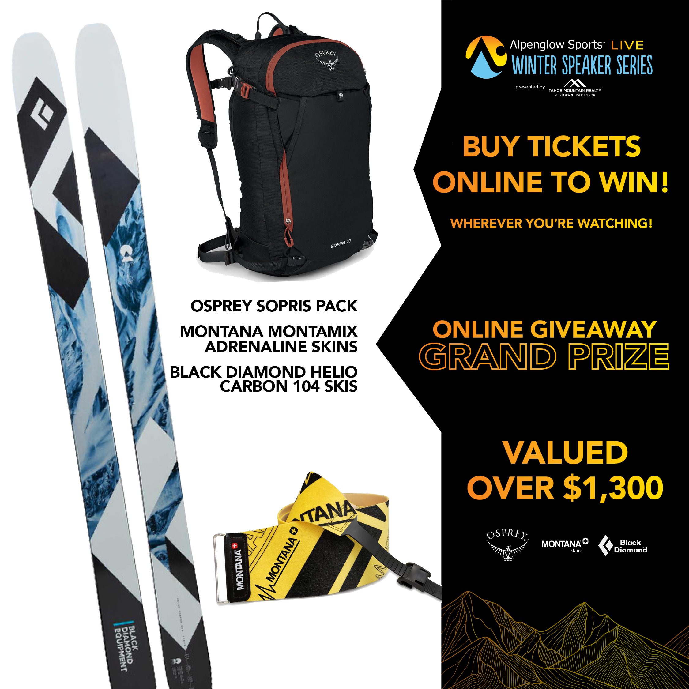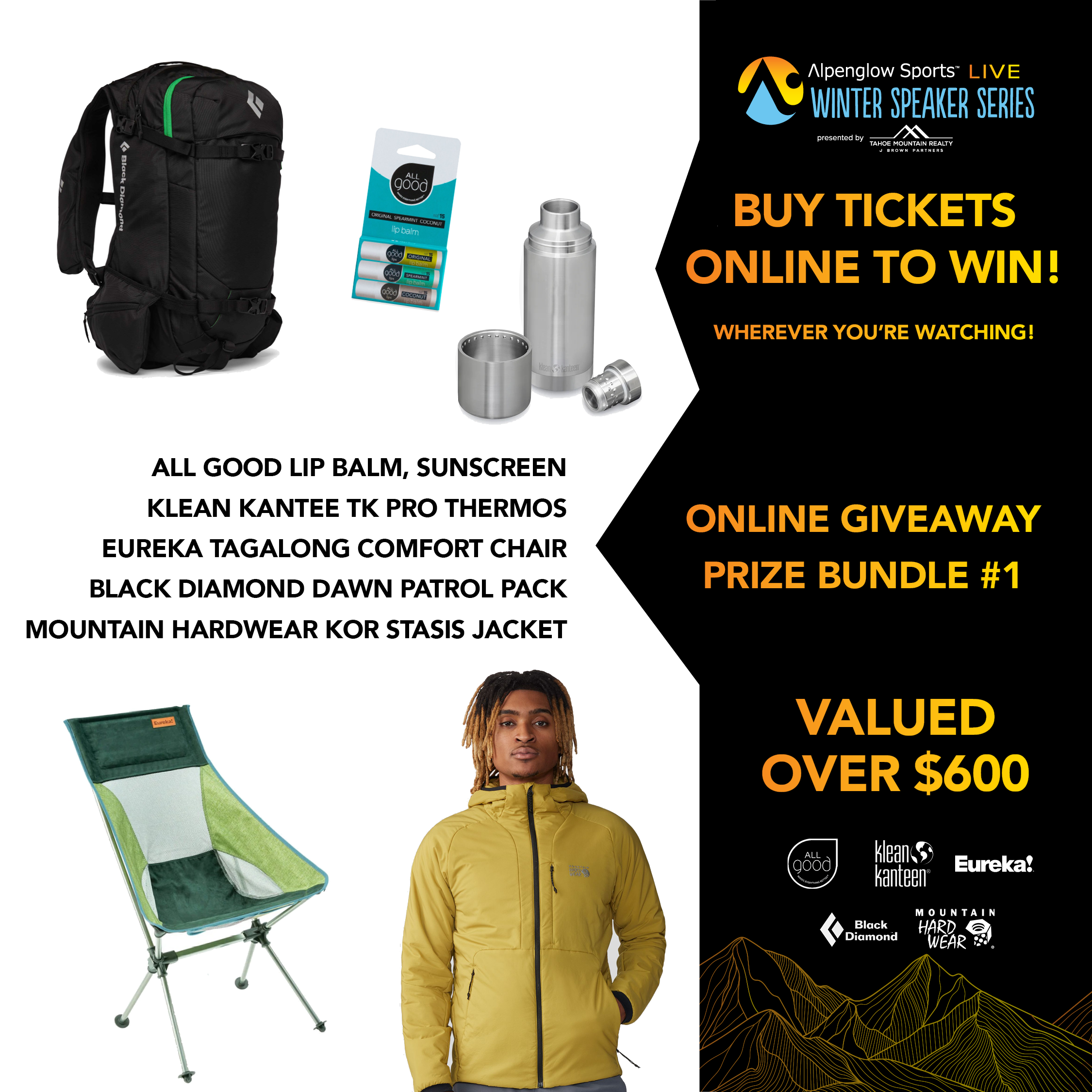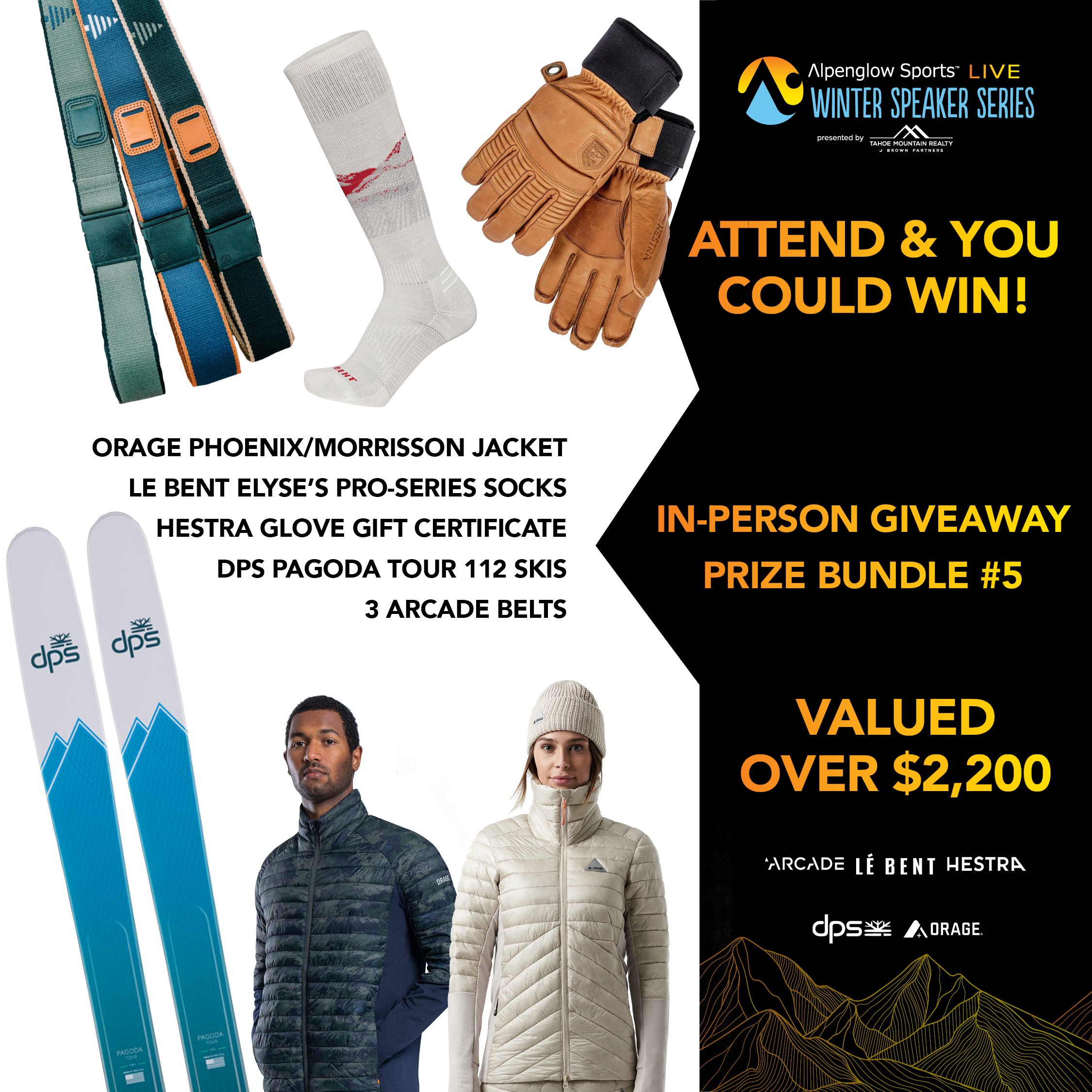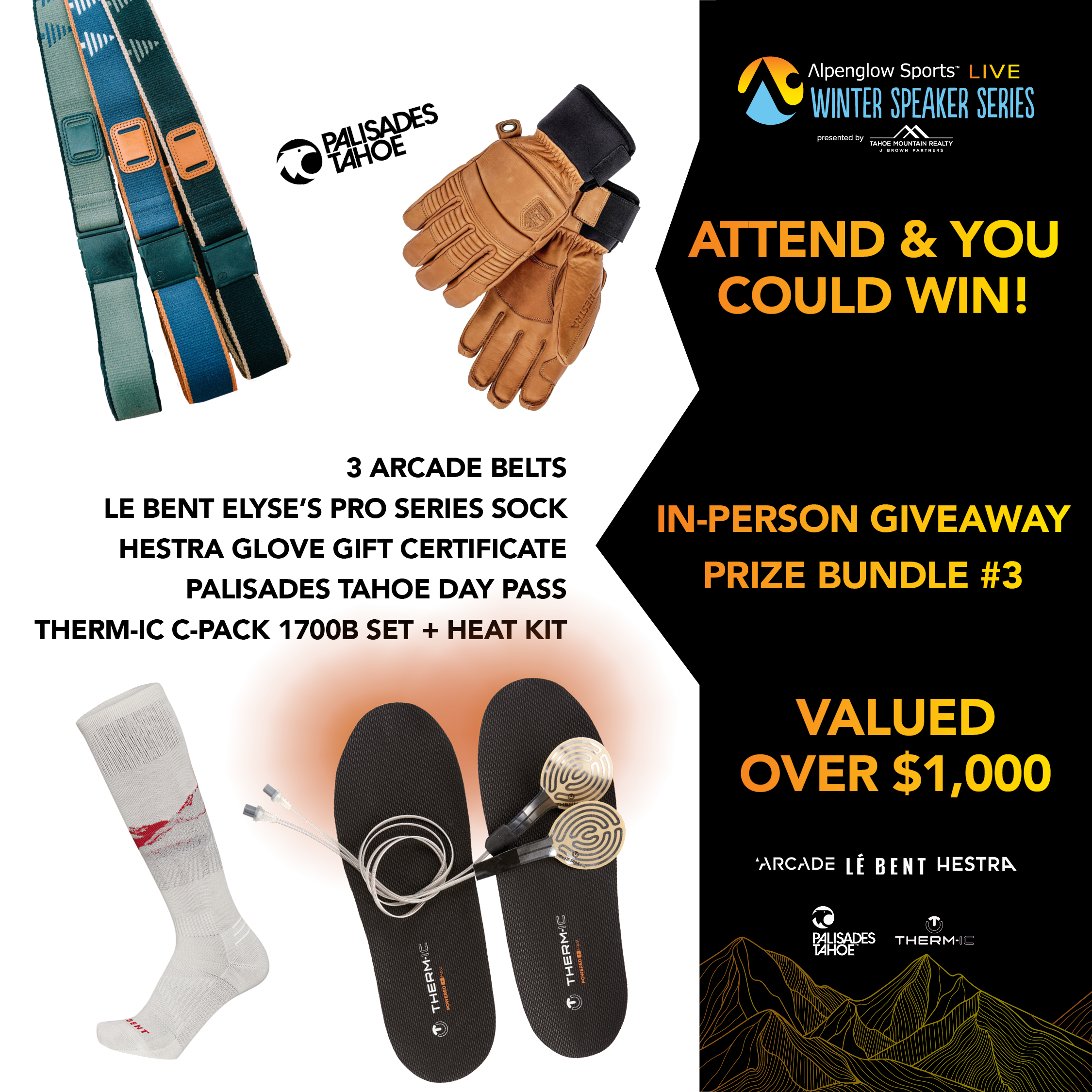 Thanks to Elyse's sponsors who are putting on an incredible giveaway for our in-person and online events. Elyse's sponsors like Arcade Belts, Hestra, Le Bent, Mammut, Orage, Tecnica/Blizzard, and Scott will add there prizes to our event sponsors and more. We expect over $15,000 in giveaway prizes.