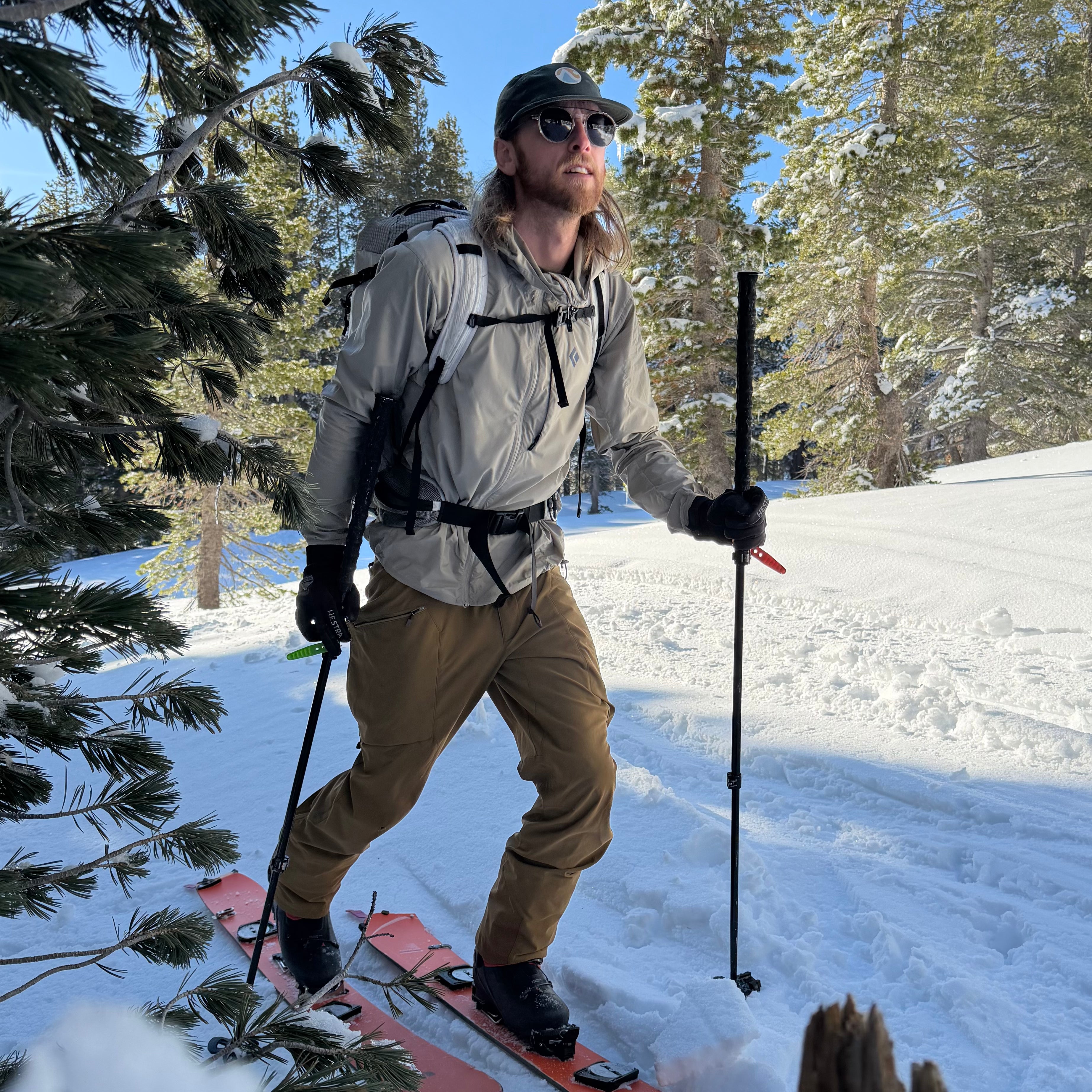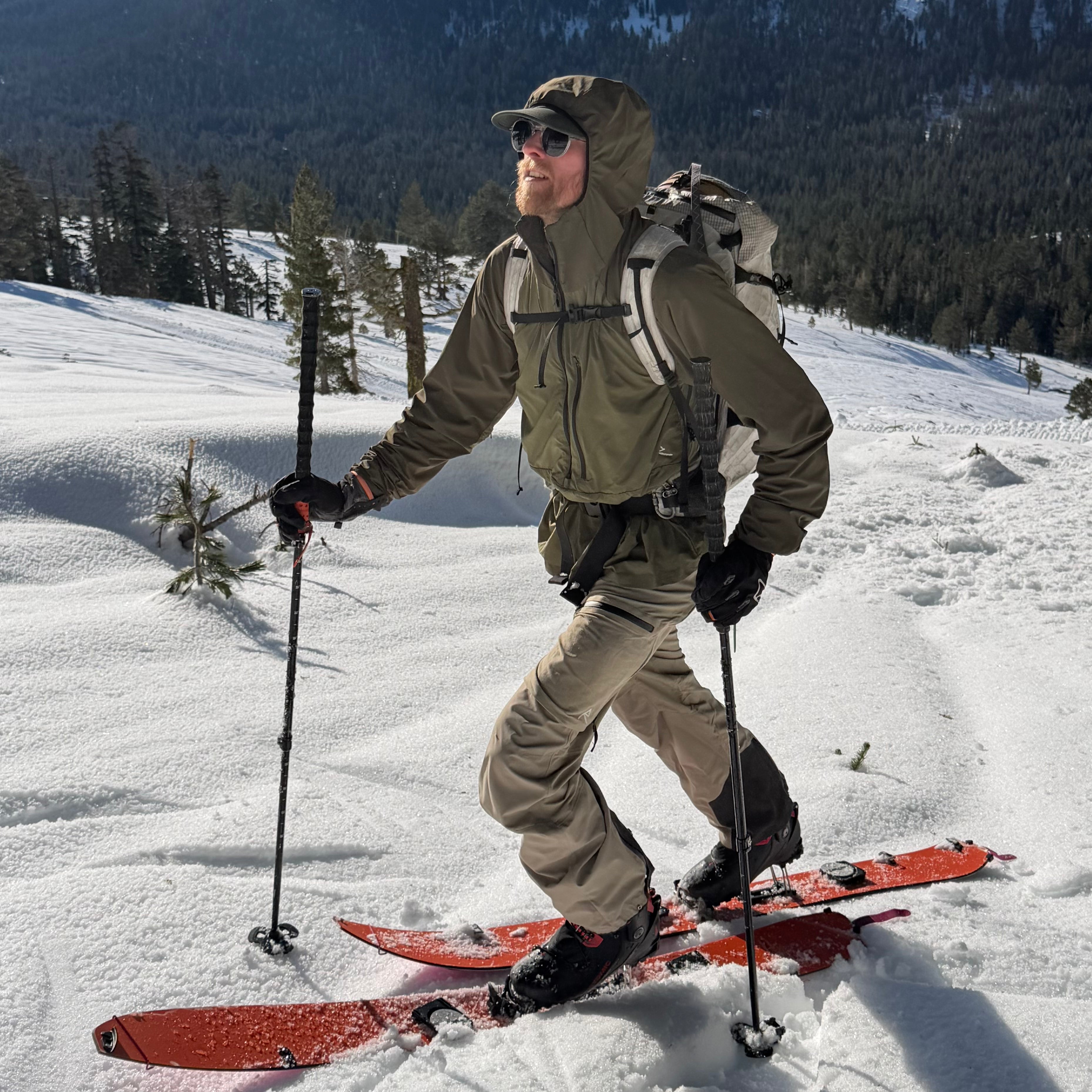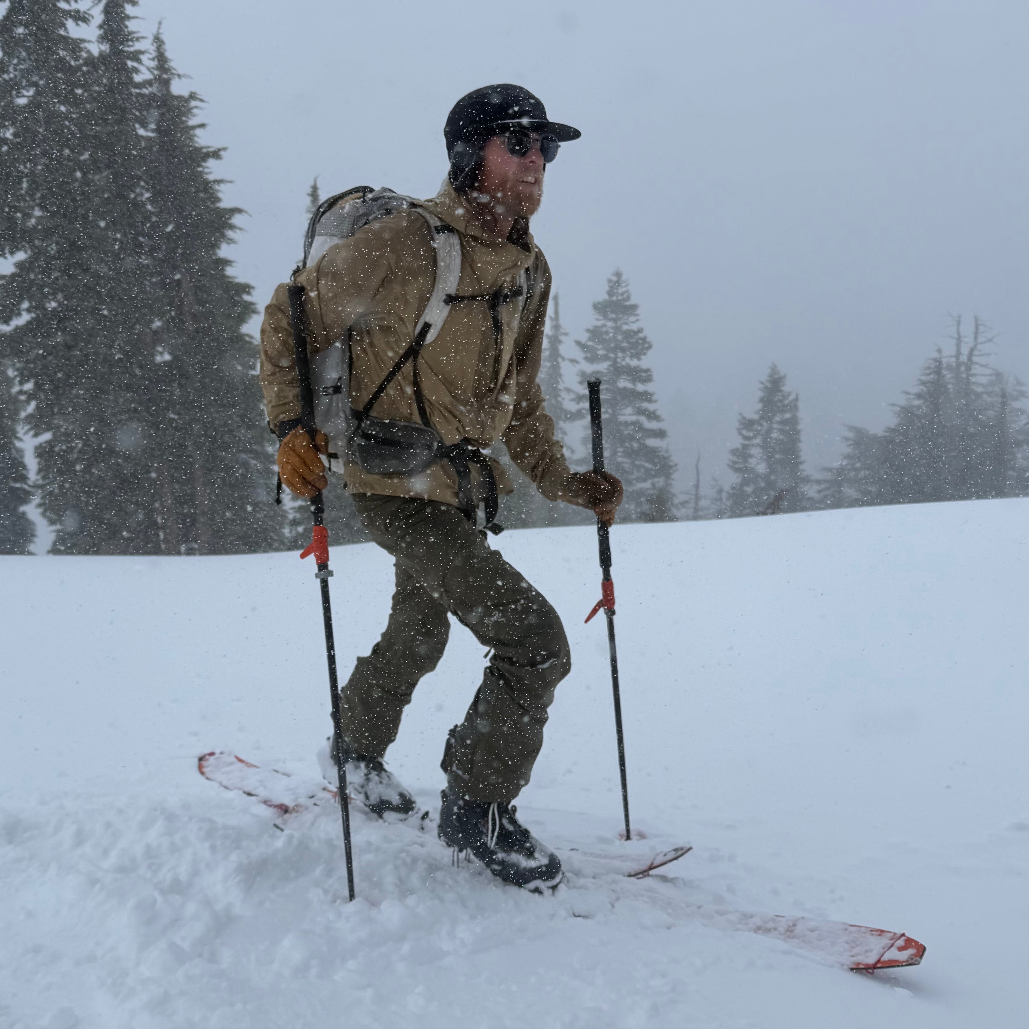 We favor the Arcteryx Gamma Hoody paired with the TourTech Hybrid Bib. This gets you great breathability in your upper body and resilience with a hybrid pant.