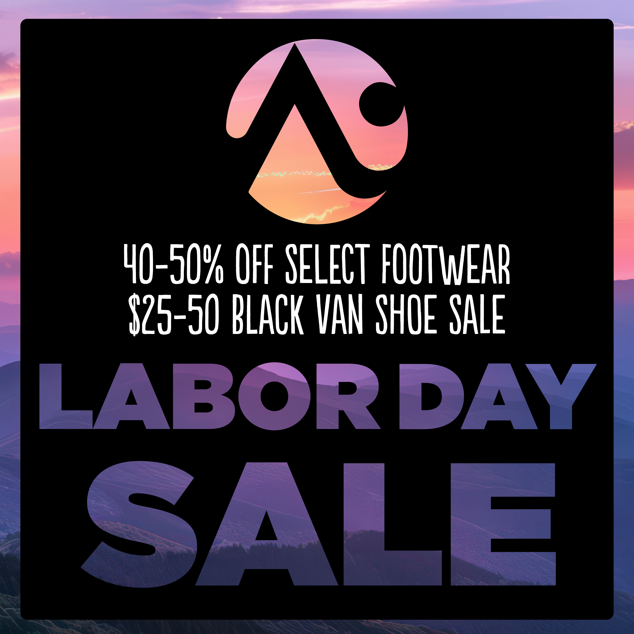 Our famous black van sale is back! Past-season shoes are just $25 or $50. These deals are only available in-store! Join us at Alpenglow Sports between Saturday, August 31st and Monday, September 2nd to score deals!