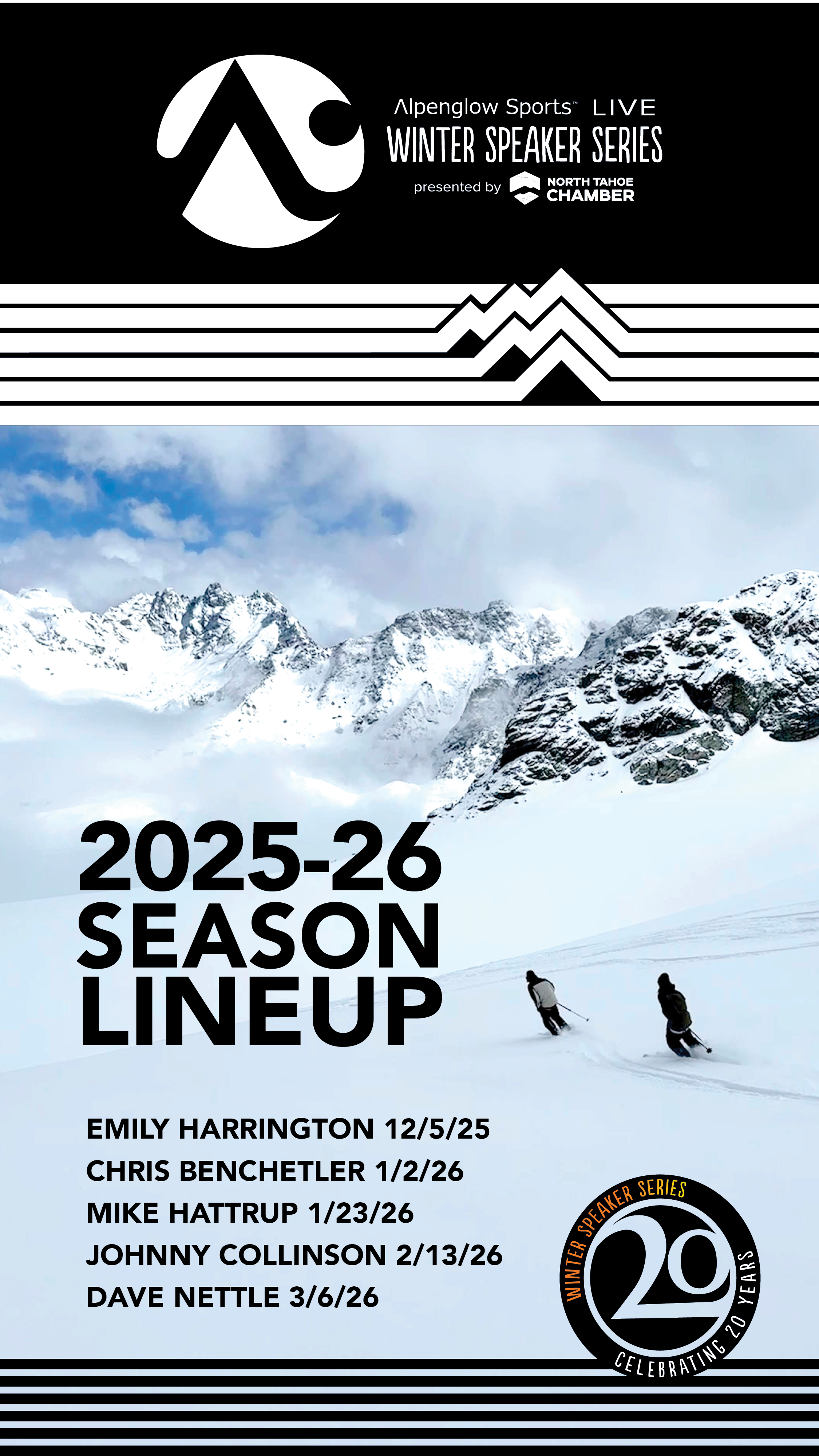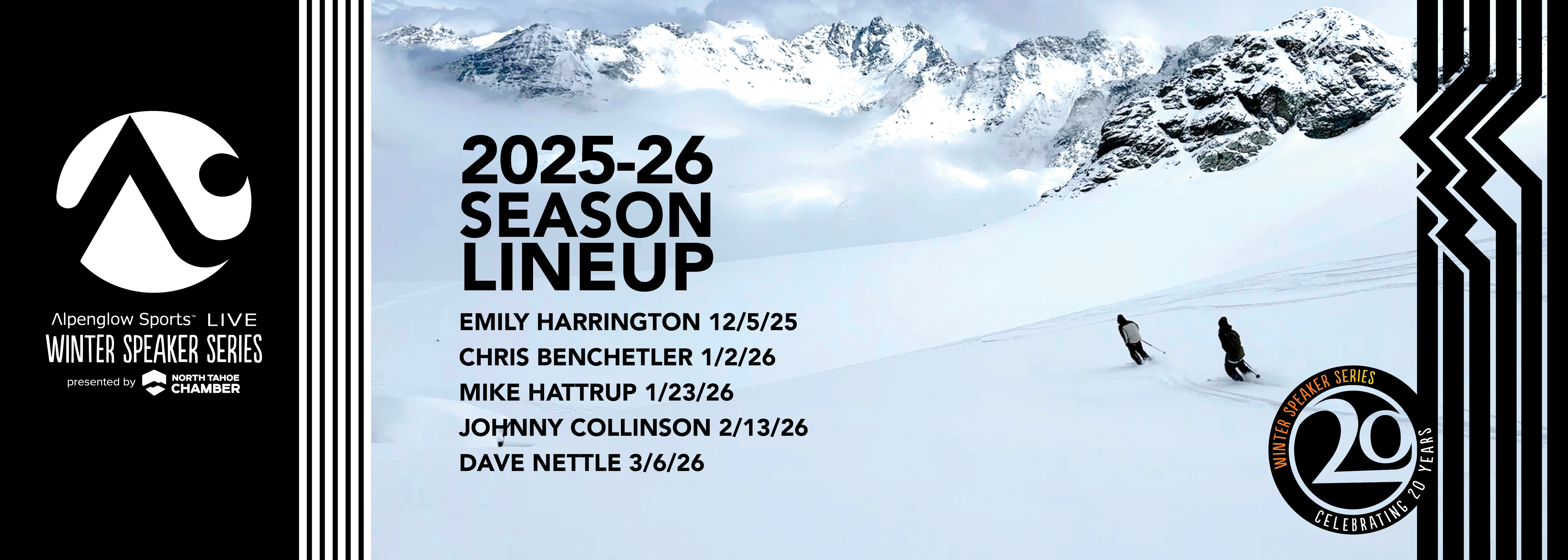The Alpenglow Sports Winter Speaker Series presented by North Tahoe Chamber is the largest free community speaker series in the country. We host the biggest names in the outdoor industry who share stories about outdoor adventure. We have two simple goals: 1) to inspire and motivate mountain athletes to pursue their outdoor dreams and 2) to raise funds for nonprofit organizations making a tangible difference in the North Lake Tahoe and Truckee community.